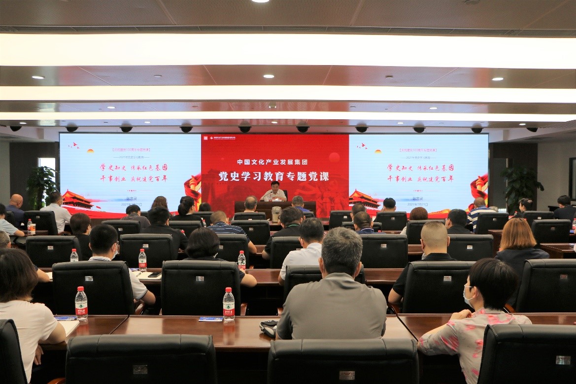 7月21日上午,中文发集团党委委员、副总经理、工会主席张忠灵以《学史知史传承红色基因 干事创业迎接建党百年》为题,为印刷公司、物资公司、人美文创、百花公司4家企业党组织及总部第四党支部党员讲授专题党课。