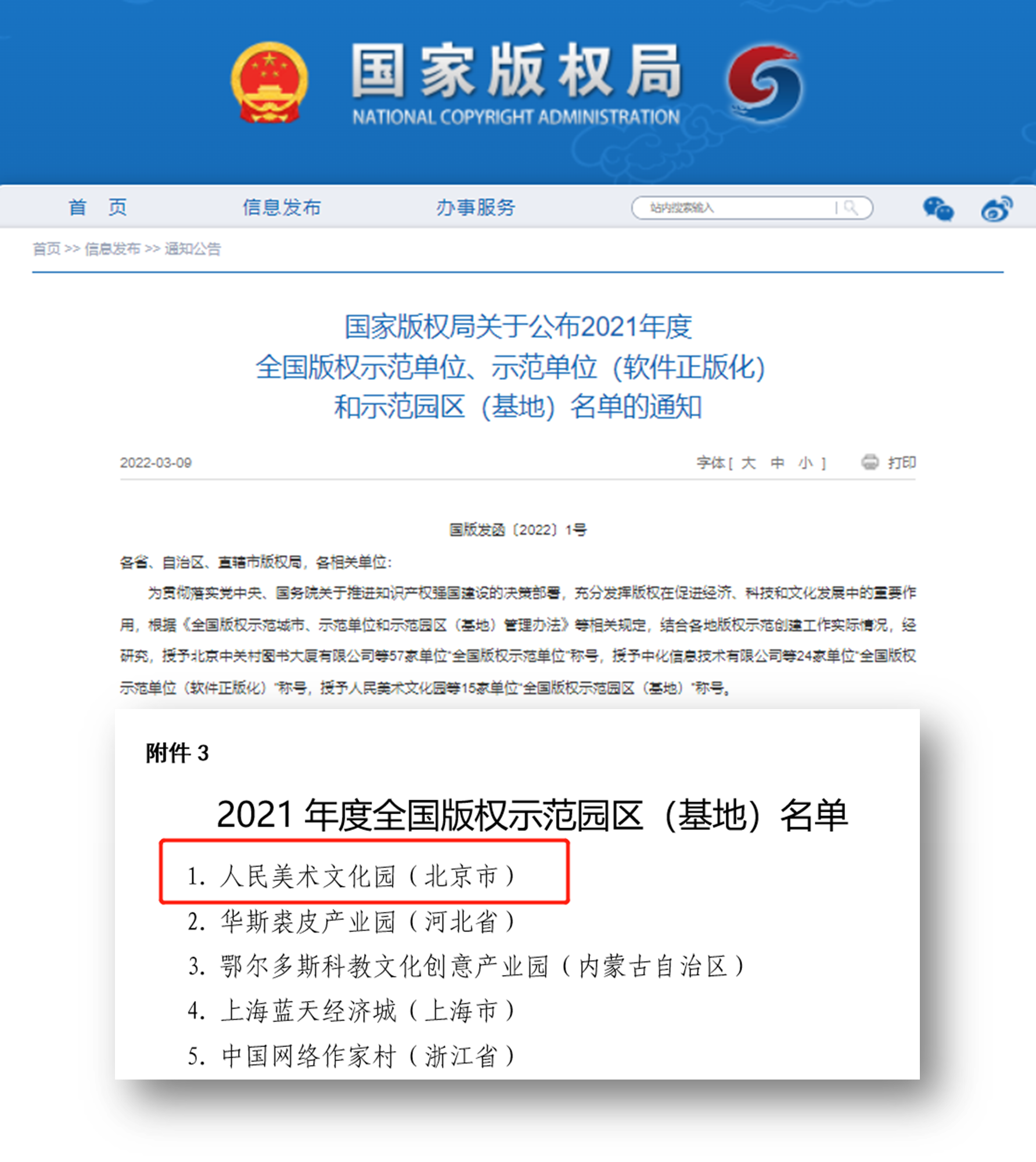 近日,国家版权局发布了2021年度全国版权示范单位、示范单位(软件正版化)和示范园区(基地)名单。中文发集团所属人民美术文化园获得“全国版权示范园区(基地)”称号,成为北京市唯一入选该奖项的单位。