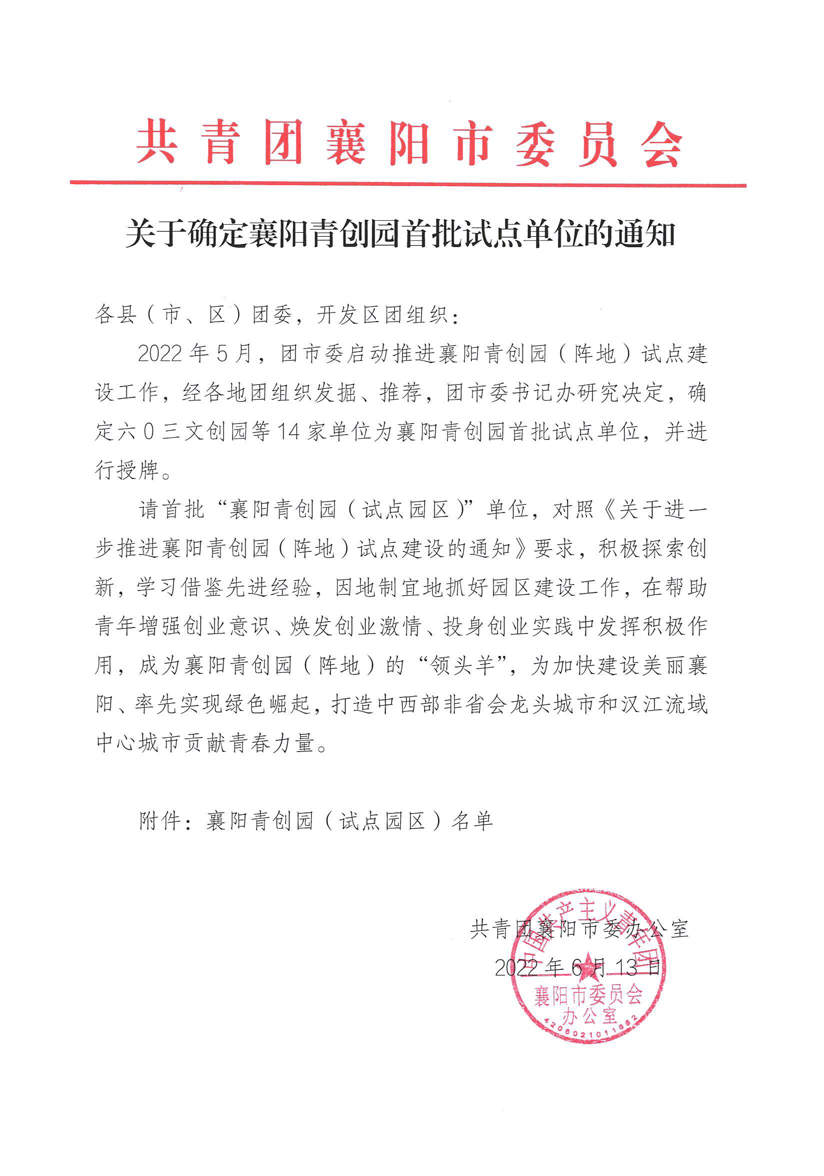 近日,六0三文创园被共青团襄阳市委员会确定为首批“襄阳青创园试点单位”。
